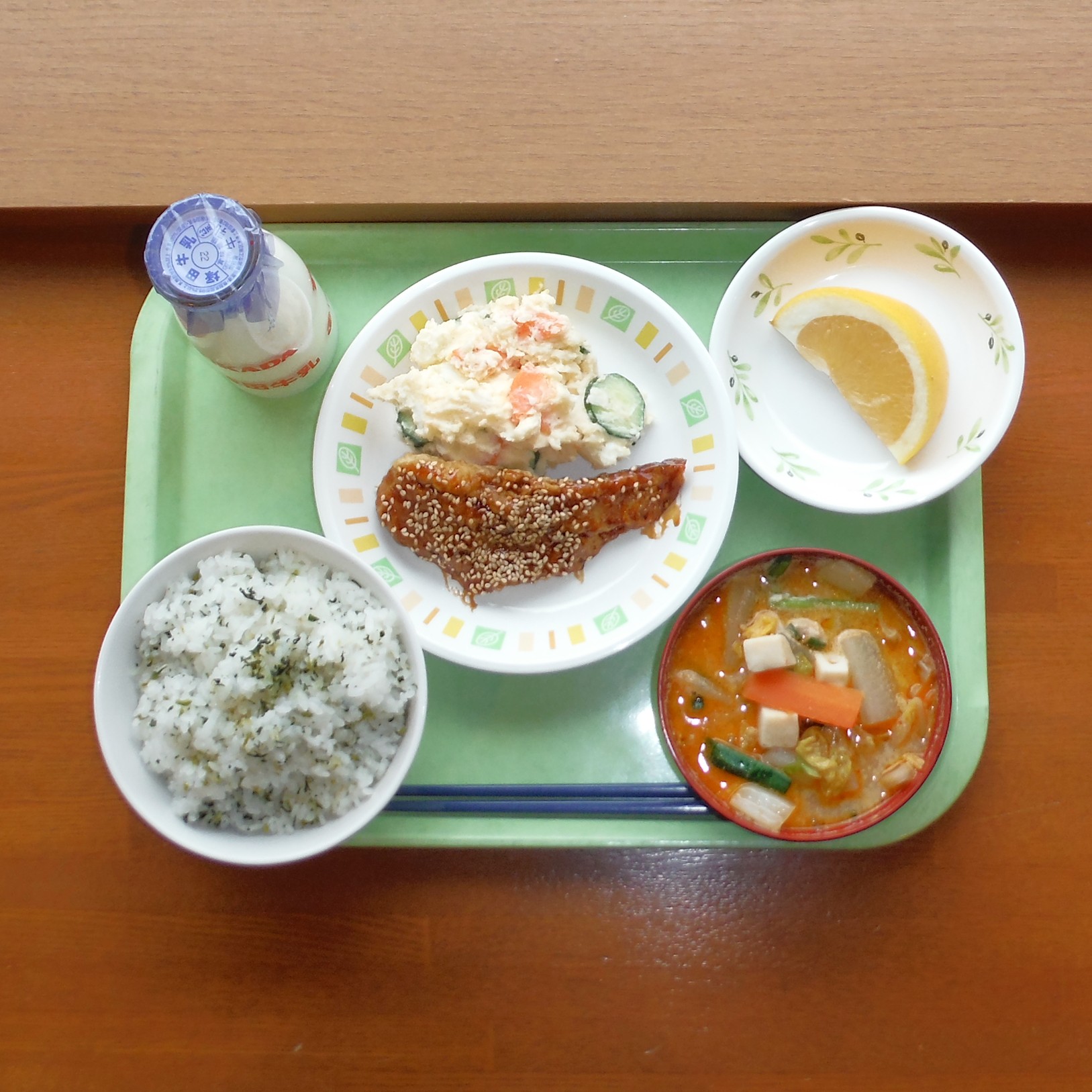 菜めし・タラ甘辛揚げ・ポテトサラダ・豆乳坦々スープ・牛乳・グレープフルーツ