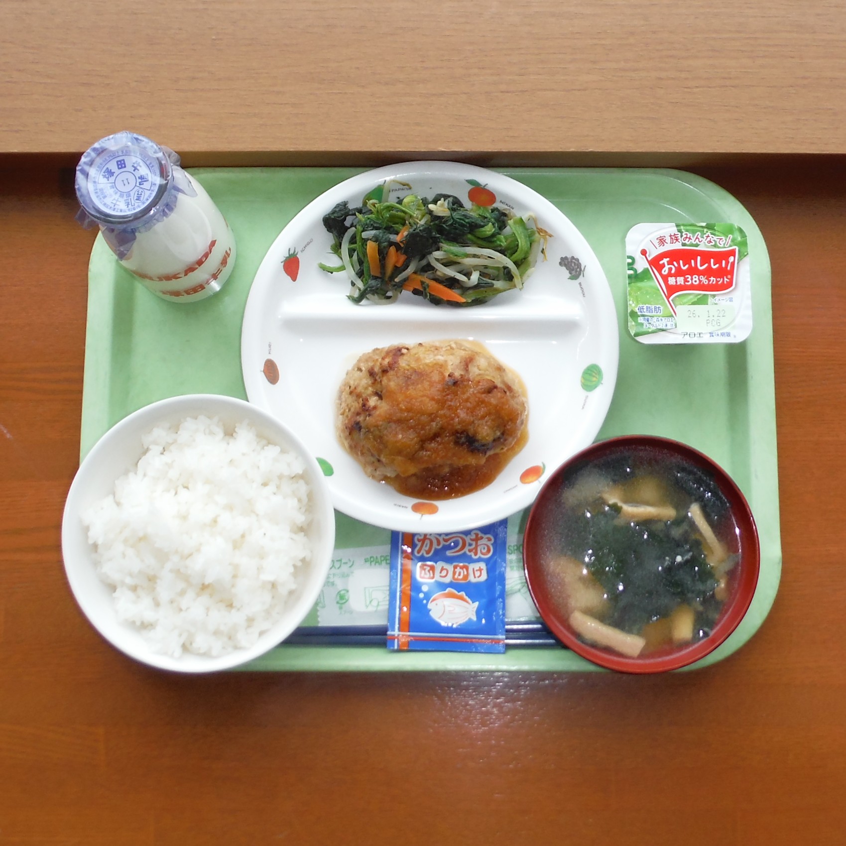 ごはん(ふりかけ)・ハンバーグ・野菜ソテー・味噌汁・牛乳・アロエヨーグルト