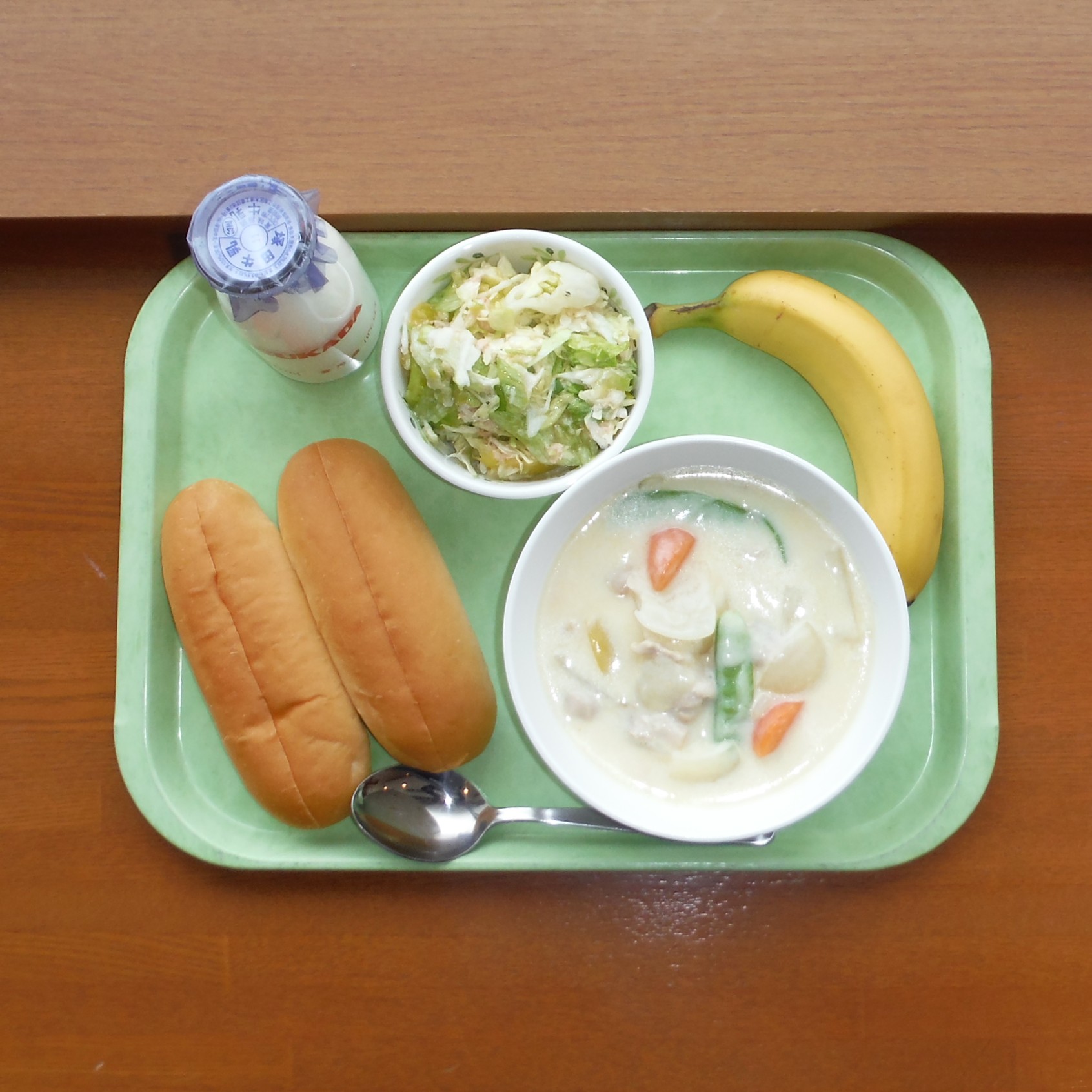 バターロール・クリームシチュー・野菜サラダ・牛乳・バナナ