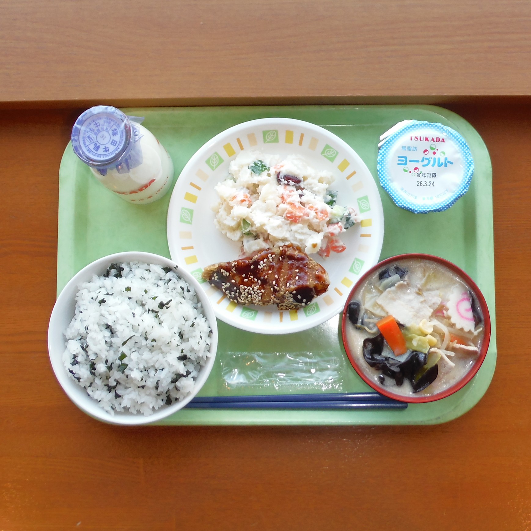 ワカメごはん・アジの甘辛揚げ・ポテトサラダ・豚骨野菜スープ・牛乳・ヨーグルト