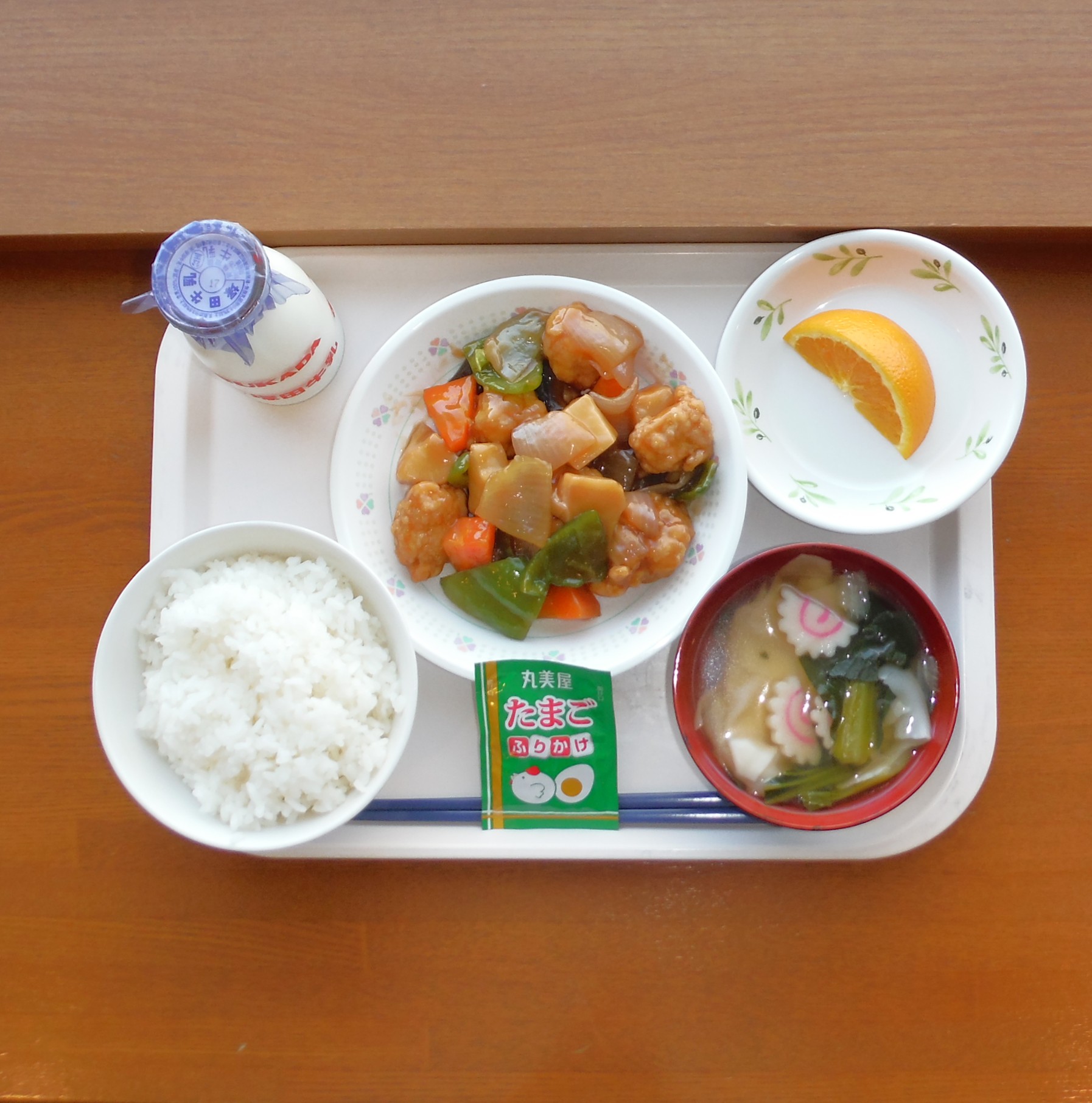 ごはん(ふりかけ)・酢豚・ワンタンスープ・牛乳・オレンジ