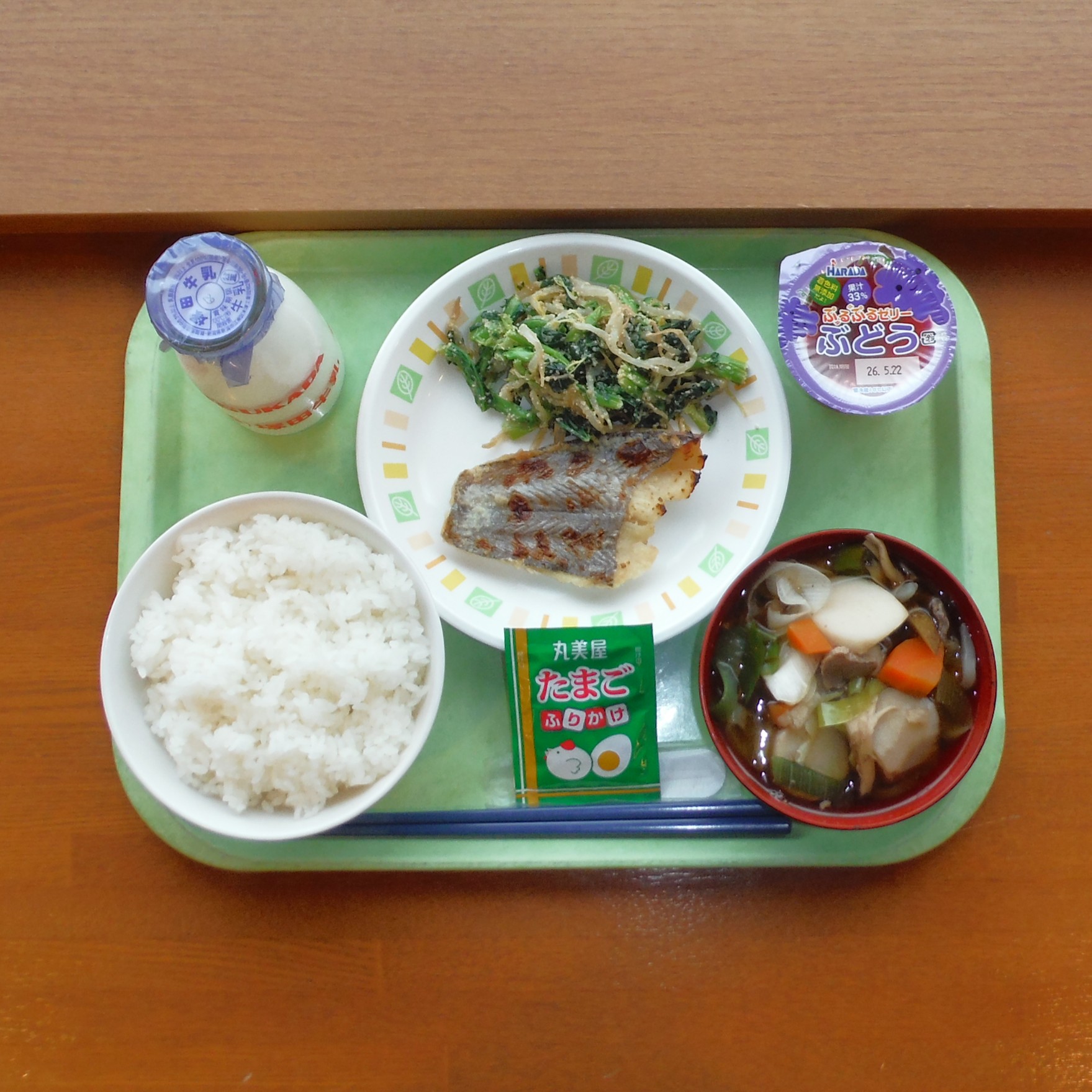 ソフト麺(きつね汁)・ちくわ磯辺揚げ・ほうれん草おひたし・牛乳・マスカットゼリー